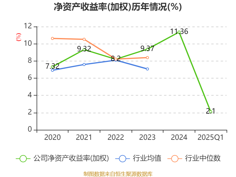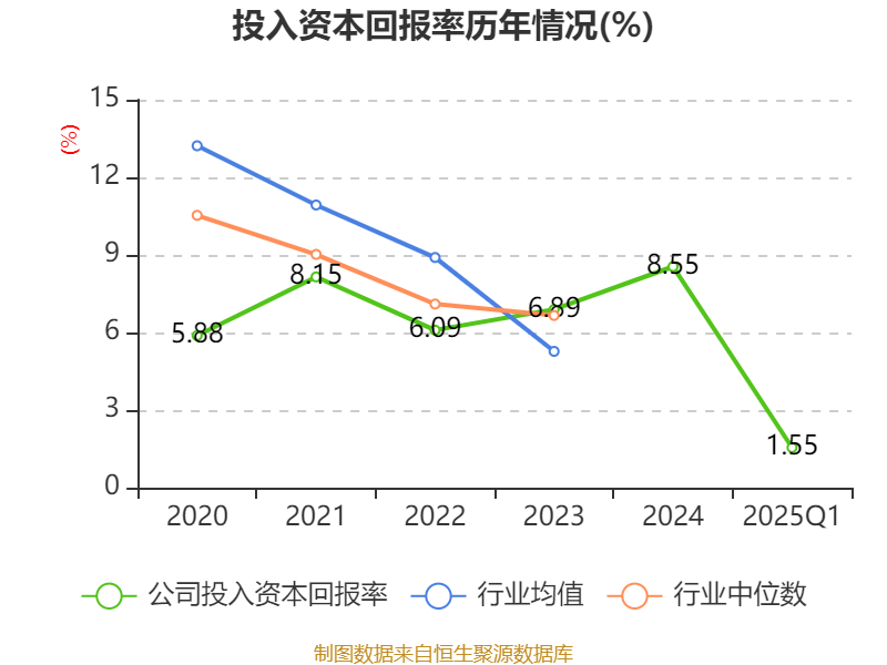 盈利能力方面, 2025年一季度公司加权平均净资产收益率为2.1%,同比下降0.07个百分点。公司2025年第一季度投入资本回报率为1.55%,较上年同期上升0.04个百分点。