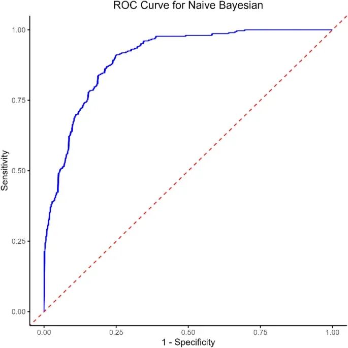 采用构建的预测模型,对自杀的识别准确率达到80.49%,灵敏度为84.76%,特异性为76.22%,曲线下面积(AUC)高达0.90,表明模型具有良好的预测能力。该模型的ROC曲线如图所示。