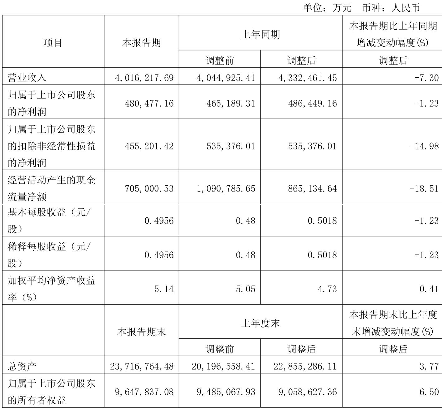 中证智能财讯陕西煤业(601225)4月26日披露2025年第一季度报告。公司实现营业总收入401.62亿元,同比下降7.30%;归母净利润48.05亿元,同比下降1.23%;扣非净利润45.52亿元,同比下降14.98%;经营活动产生的现金流量净额为70.5亿元,同比下降18.51%;报告期内,陕西煤业基本每股收益为0.4956元,加权平均净资产收益率为5.14%。