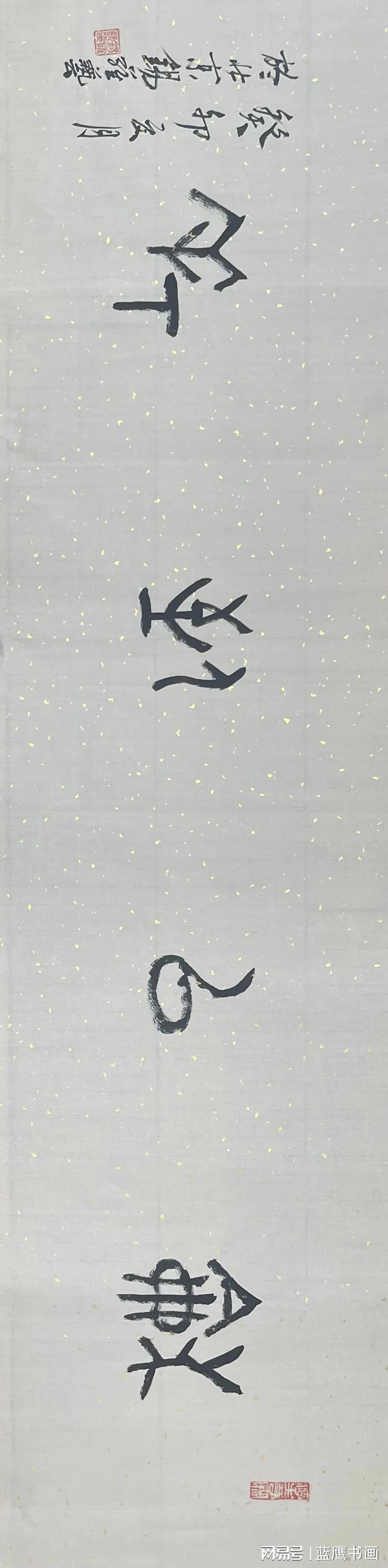 其墨色浓淡相间,于洒金宣纸上更显古意斑驳,正如《书谱》所云“观夫悬针垂露之异,奔雷坠石之奇”,此作于大篆法度中求气韵,于吉金遗韵里见精神,诚为追慕三代、契合金文之佳作。